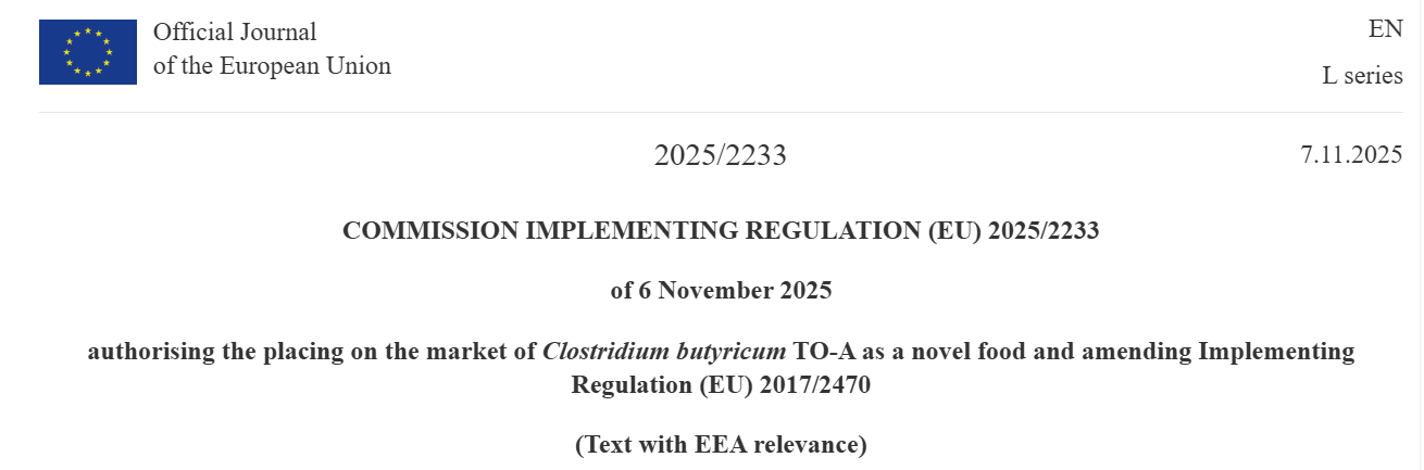 欧盟委员会通过条例Reg.(EU)2025/2233,正式授权将 Clostridium butyricum TO-A列入欧盟 Novel Food “Union List” (即允许在欧盟市场上销售)。该条例在发布后20日生效。 |