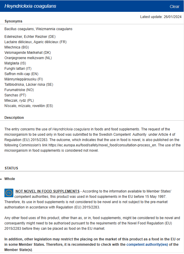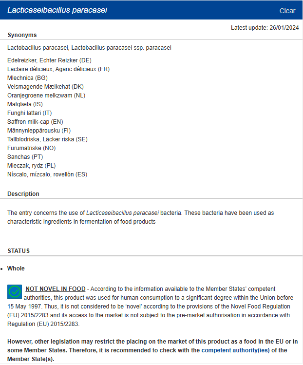 A:“欧盟新型食品状态判定目录EU Novel Food status Catalogue”有对很多菌种(尤其是常见的乳酸菌菌种)进行了新型食品状态判定,虽然未详尽收录,但可作为合规依据。比如副干酪乳酪杆菌Lacticaseibacillus paracasei(在食品中不属于新型食品)、凝结芽孢杆菌Heyndrickxia coagulans(在食品补充剂中不属于新型食品)。