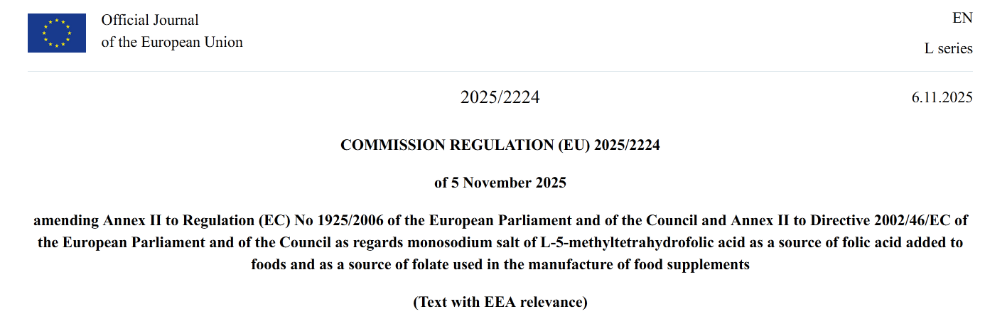 2025年11月5日,欧盟官方公报(OJEU)发布了2项实施条例发布(Reg. (EU)2025/2224 与Reg.(EU)2025/2225),分别就L-5-甲基四氢叶酸单钠盐作为食品叶酸来源及食品补充剂叶酸来源、L-苏糖酸镁作为食品补充剂镁来源,对相关欧盟法规附件进行修订,为两种原料的合规使用提供依据。其将于发布后的20天(即2025年11月26日起)生效。