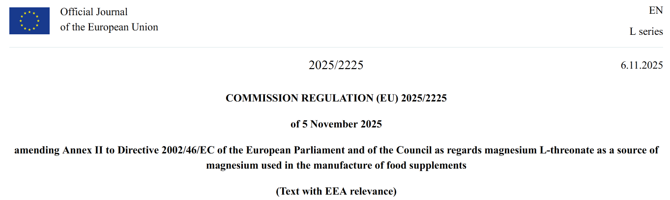 实施条例 Reg.(EU)2025/2225 - magnesium L-threonate as a source of magnesium used in the manufacture of food supplements