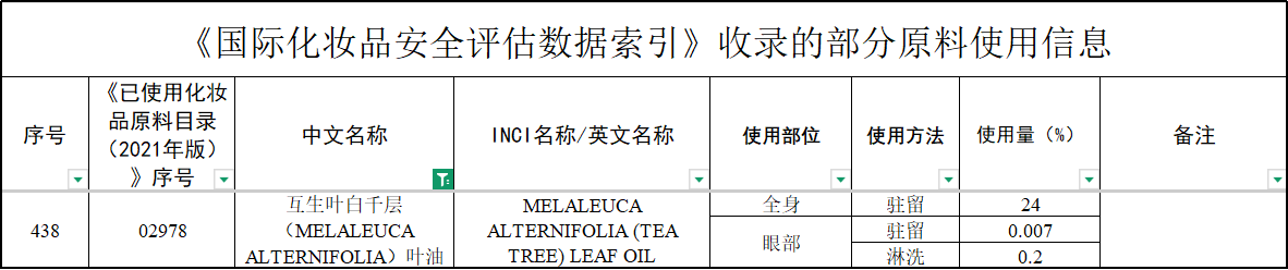 🔵根据《国际化妆品安全评估数据索引》收录的部分原料使用信息,TTO在用于全身皮肤的驻留类产品中最高历史使用量为24%,眼部驻留类产品中的最高历史使用量为0.007%,眼部淋洗类产品中的最高历史使用量为0.2%。