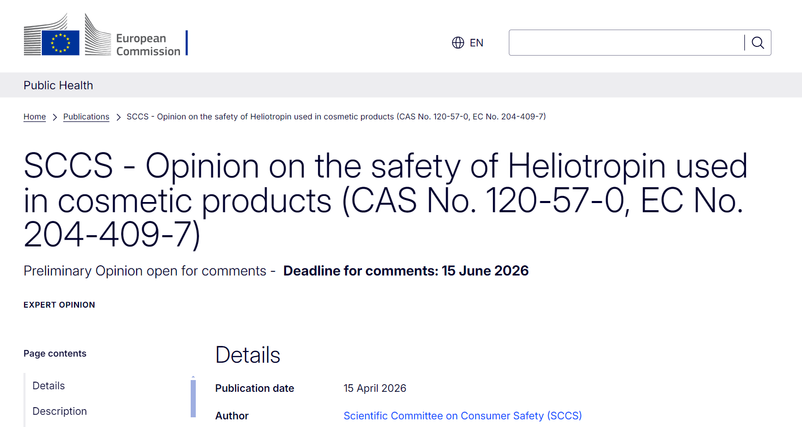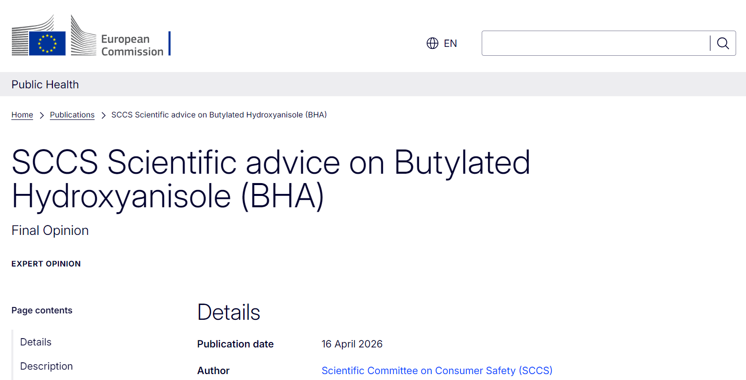 2026年4月15日–16日,欧盟消费者安全科学委员会(SCCS)发布两项科学意见:一项为关于胡椒醛(Heliotropin)在化妆品中使用安全性的初步意见(公开征求意见截至6月15日);另一项为关于丁羟茴醚(Butylated Hydroxyanisole,BHA)的最终意见(此前已于2025年11月公开征求意见)。