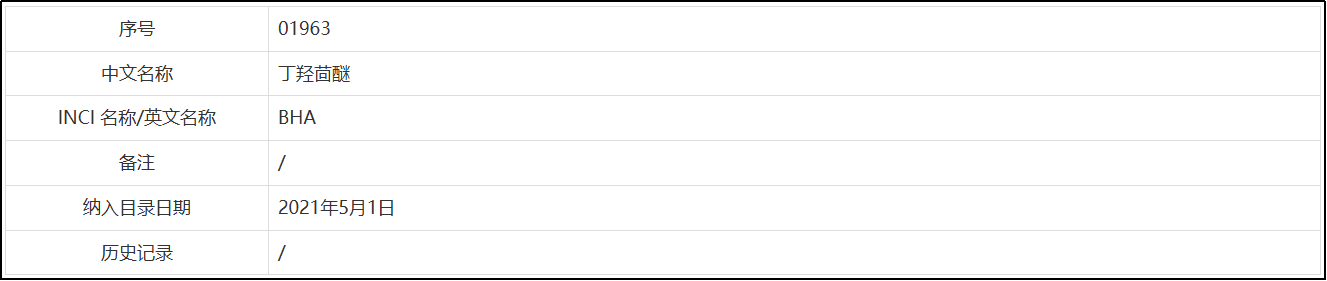 🔸BHA收录于《已使用化妆品原料目录》I。