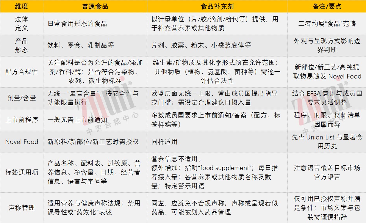 入市前应明确产品属性:是普通食品还是食品补充剂,并核实是否涉及药品范畴。逐项核查配料合规性:是否为允许的食品配料、添加剂、香料或酶,是否可能构成 Novel Food。确认进口国,参照其补充剂监管要求(如上市前通知、含量限值、标签语言与排版规范),避免“单一国家合规适用于全欧”的误区。