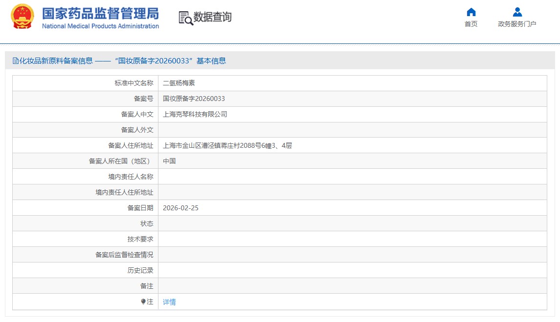 二氢杨梅素(备案号:国妆原备字20260033),由上海克琴科技有限公司备案。目前相关技术要求尚未披露,且尚未进入监测期。