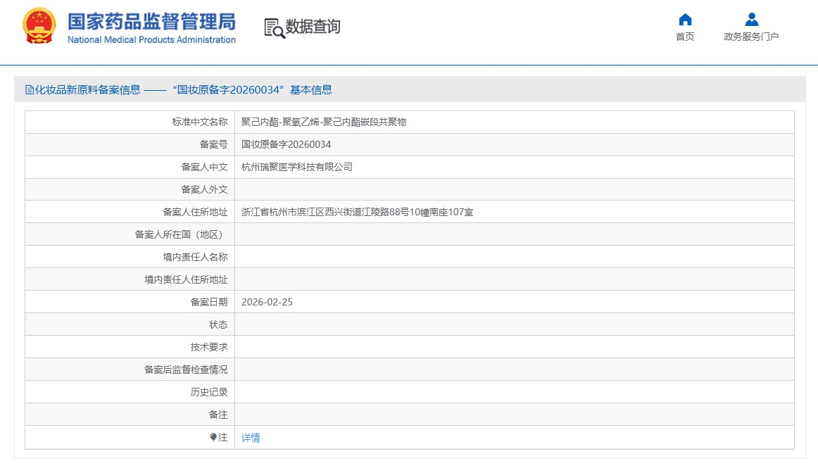 ⭕聚己内酯-聚氧乙烯-聚己内酯嵌段共聚物(备案号:国妆原备字20260034),目前相关技术要求尚未披露,且尚未进入监测期。