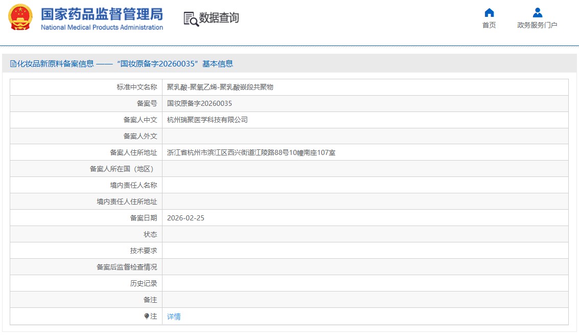 ⭕聚乳酸-聚氧乙烯-聚乳酸嵌段共聚物(备案号:国妆原备字20260035),目前相关技术要求尚未披露,且尚未进入监测期。