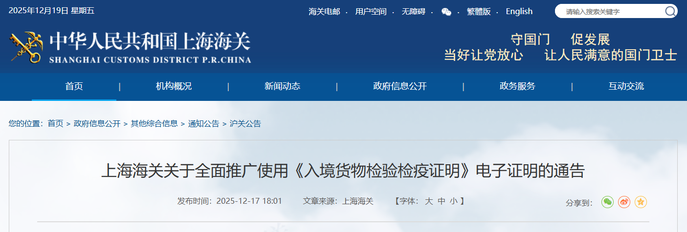为进一步便利企业获取检验检疫证单,上海海关将于即日起,全面推广使用《入境货物检验检疫证明》电子证单(以下简称“电子证单”)。现将有关事项通告如下: