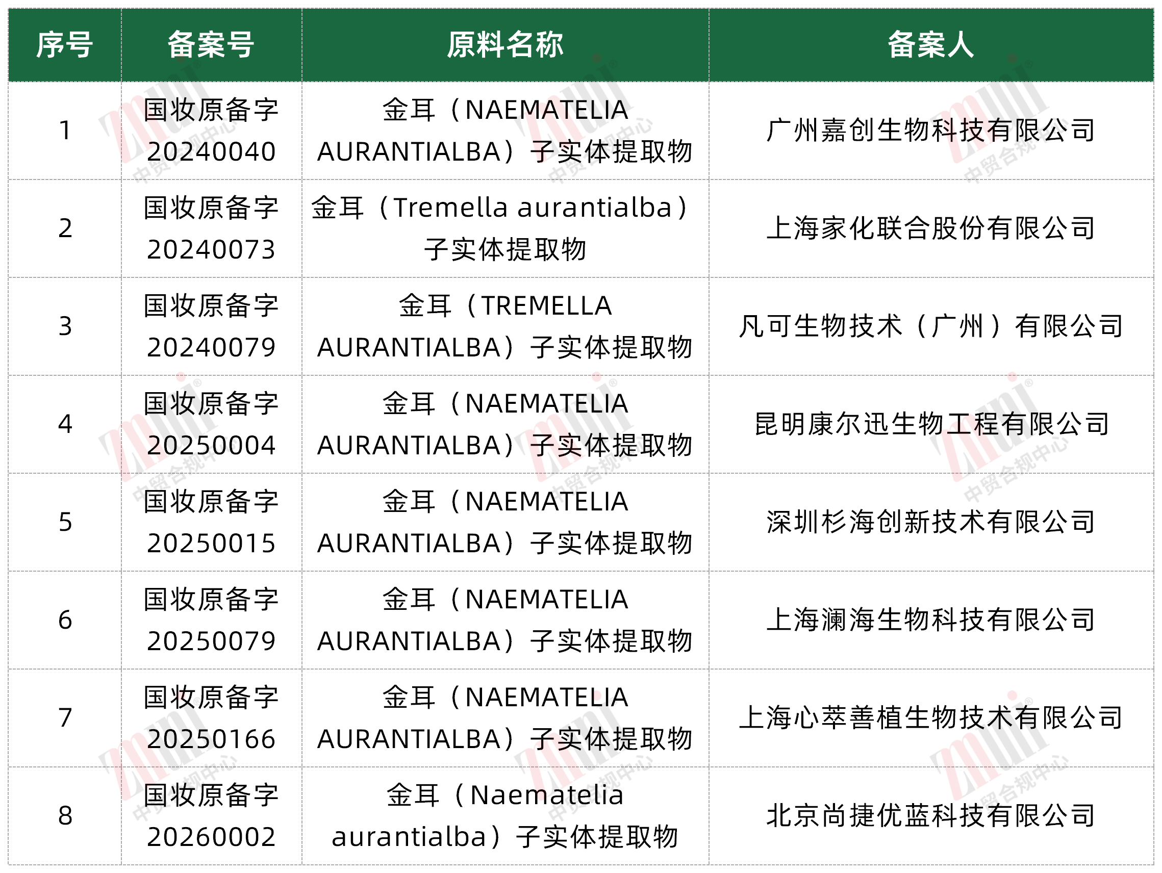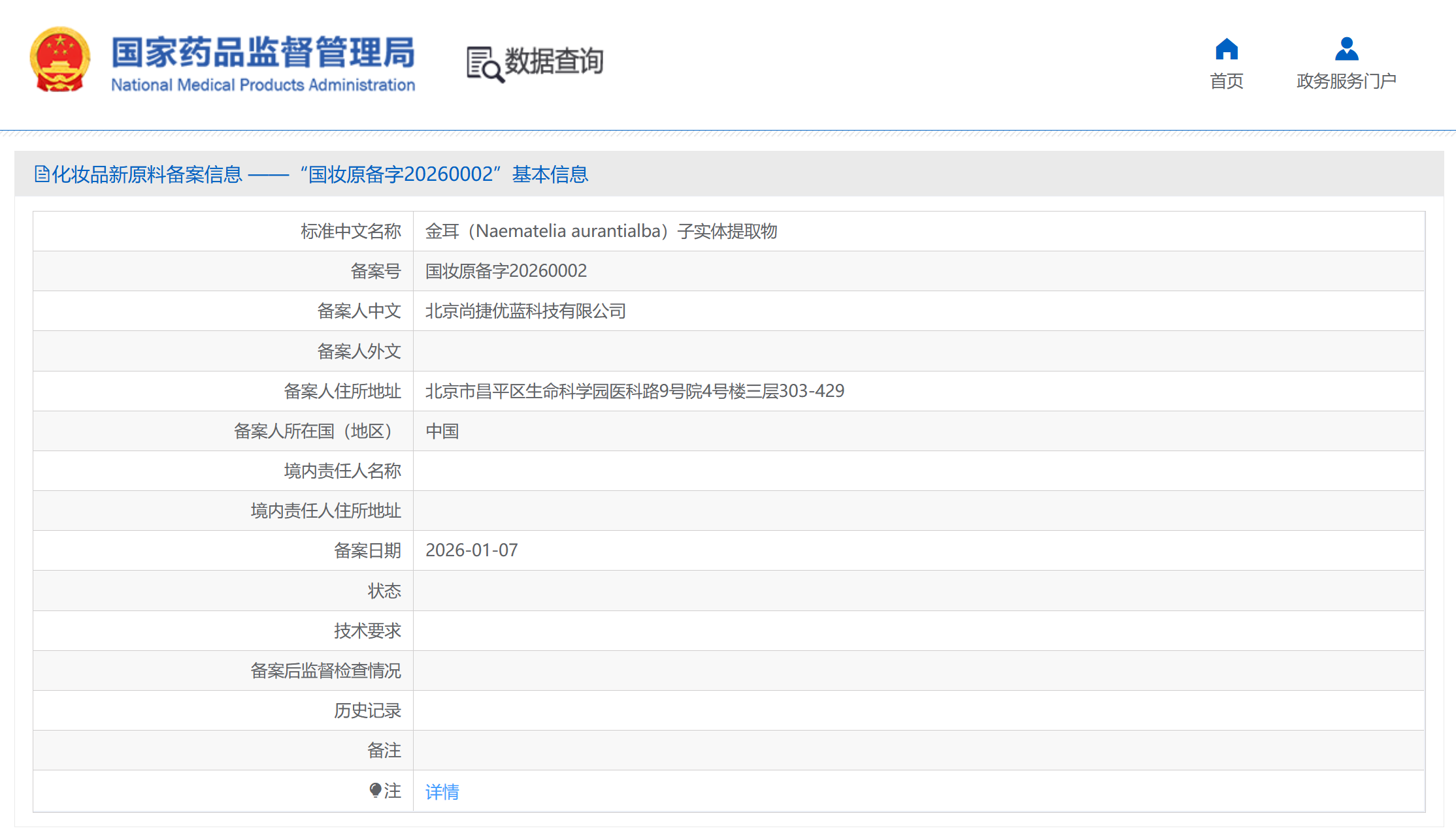 金耳(Naematelia aurantialba)子实体提取物(备案号:国妆原备字20260002),由北京尚捷优蓝科技有限公司备案。目前相关技术要求尚未披露,且尚未进入监测期。