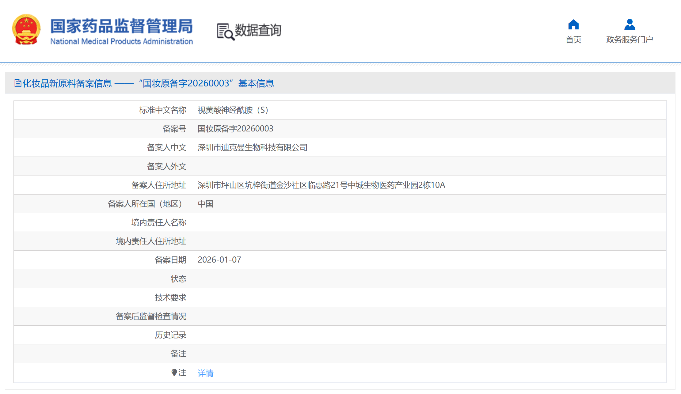 视黄酸神经酰胺(S)(备案号:国妆原备字20260003),由深圳市迪克曼生物科技有限公司备案。目前相关技术要求尚未披露,且尚未进入监测期。