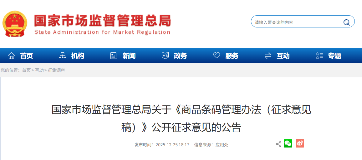 为进一步加强商品条码管理,国家市场监督管理总局研究起草了《商品条码管理办法(征求意见稿)》,现向社会公开征求意见。公众可通过以下途径和方式提出意见: