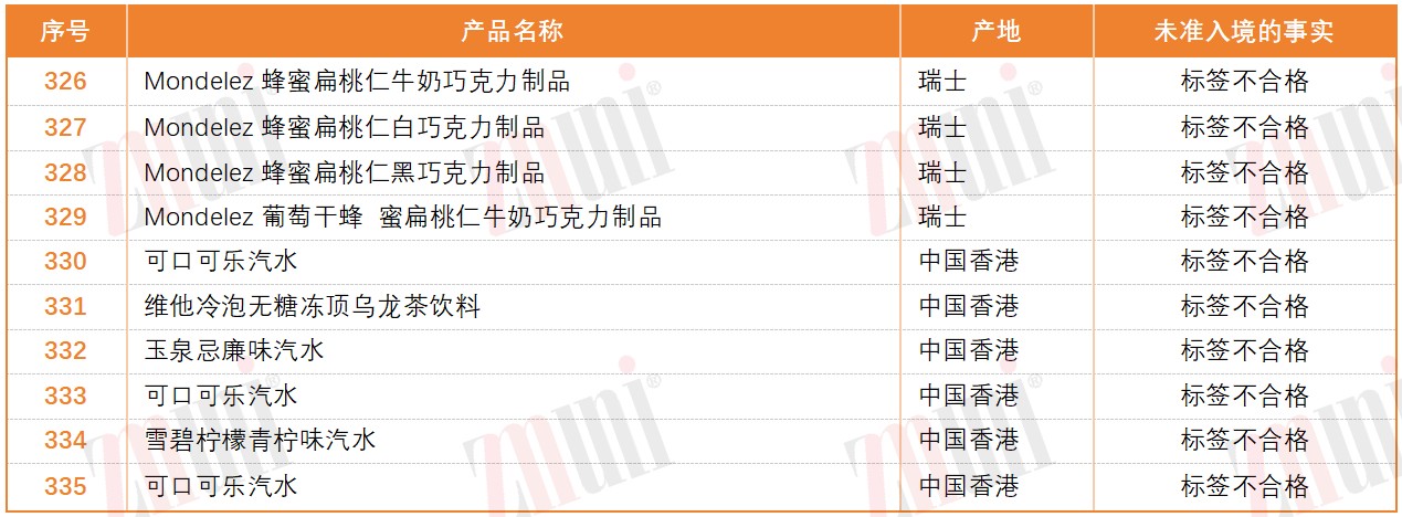 值得注意的是,10月未准入境记录中存在49批标签不合格的记录。标签不合格的产品众多,品类覆盖饮料、乳制品、糖果、调味品、淀粉、酒类等,来源地也包括中国香港、越南、日本、马来西亚、瑞士、美国、阿根廷等十余个国家与地区。其中不乏知名品牌产品,如瑞士“Mondelez”系列巧克力制品、中国香港“维他奶”“可口可乐”系列饮料、日本“日清”方便面等,反映出标签合规问题在各类企业与产品中普遍存在。