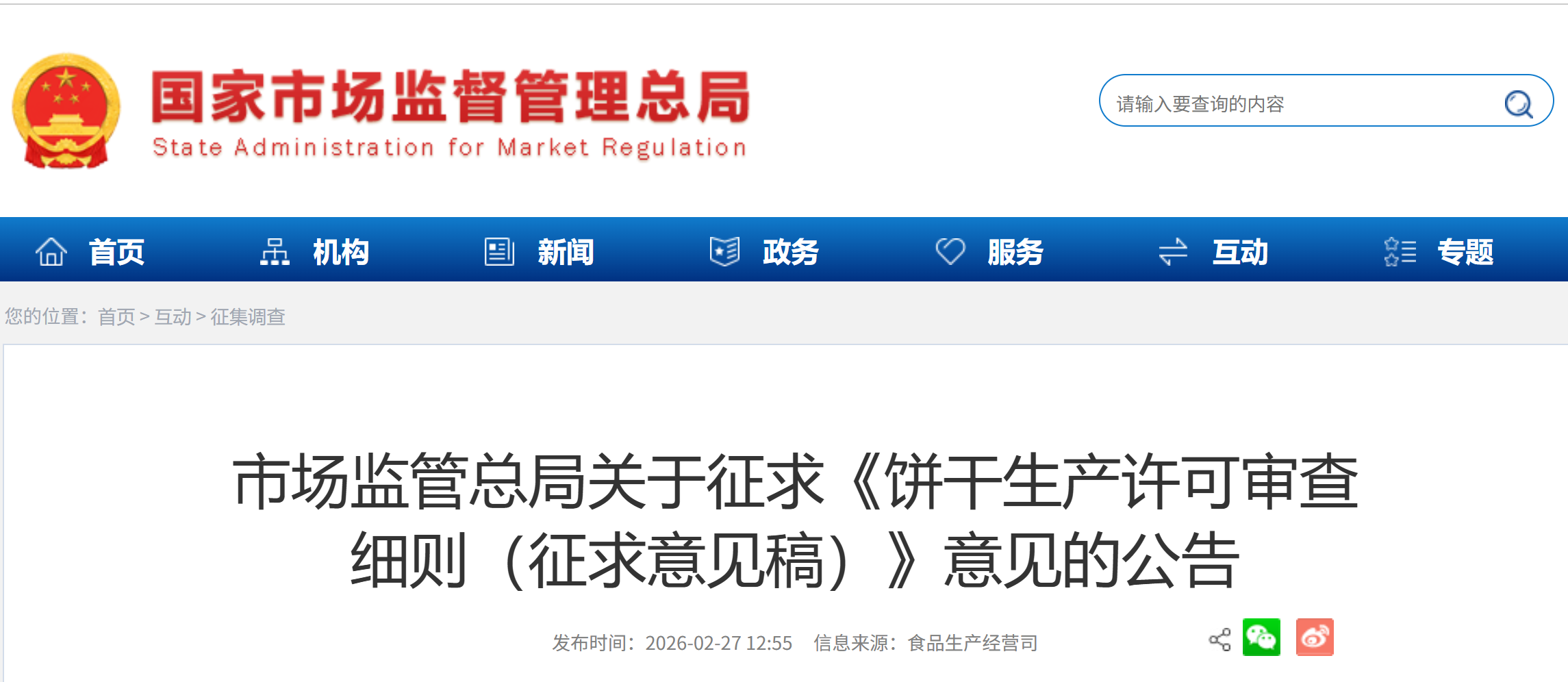 为规范指导饼干生产许可工作,加强饼干质量安全监管,市场监管总局组织起草了《饼干生产许可审查细则(征求意见稿)》,现向社会公开征求意见。欢迎各有关单位和个人提出修改意见,并于2026年3月30日前将《公开征求意见反馈表》反馈至市场监管总局。公众可通过以下途径和方式提出意见: