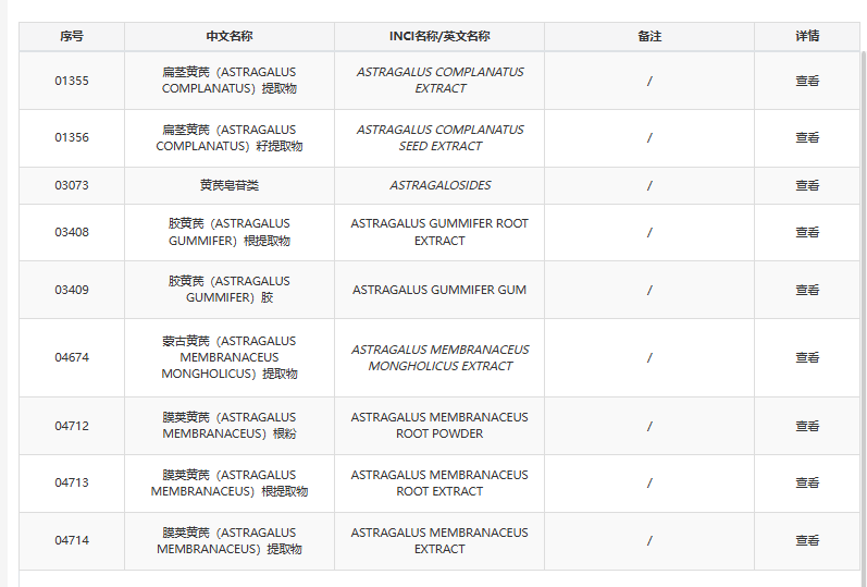 根据已使用化妆品原料目录,目前可用于化妆品中的黄芪类原料有7项,主要是黄芪相关提取物和黄芪皂苷类。