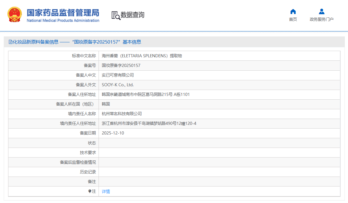 海州香薷(ELETTARIA SPLENDENS)提取物(备案号:国妆原备字20250157),由实已可意有限公司备案。目前相关技术要求尚未披露,且尚未进入监测期。