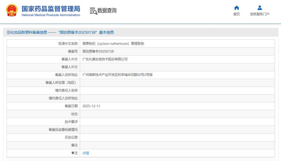 黑果枸杞(Lycium ruthenicum)果提取物(备案号:国妆原备字20250158),由广东丸美生物技术股份有限公司备案。目前相关技术要求尚未披露,且尚未进入监测期。