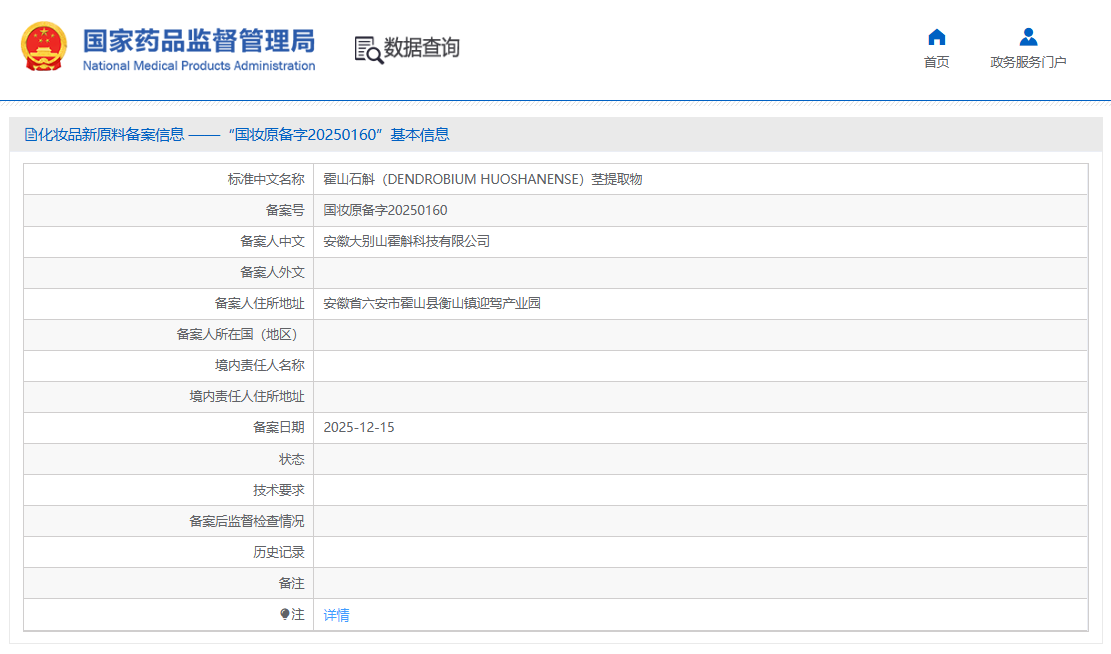 霍山石斛(DENDROBIUM HUOSHANENSE)茎提取物(备案号:国妆原备字20250160),由安徽大别山霍斛科技有限公司备案。目前相关技术要求尚未披露,且尚未进入监测期。