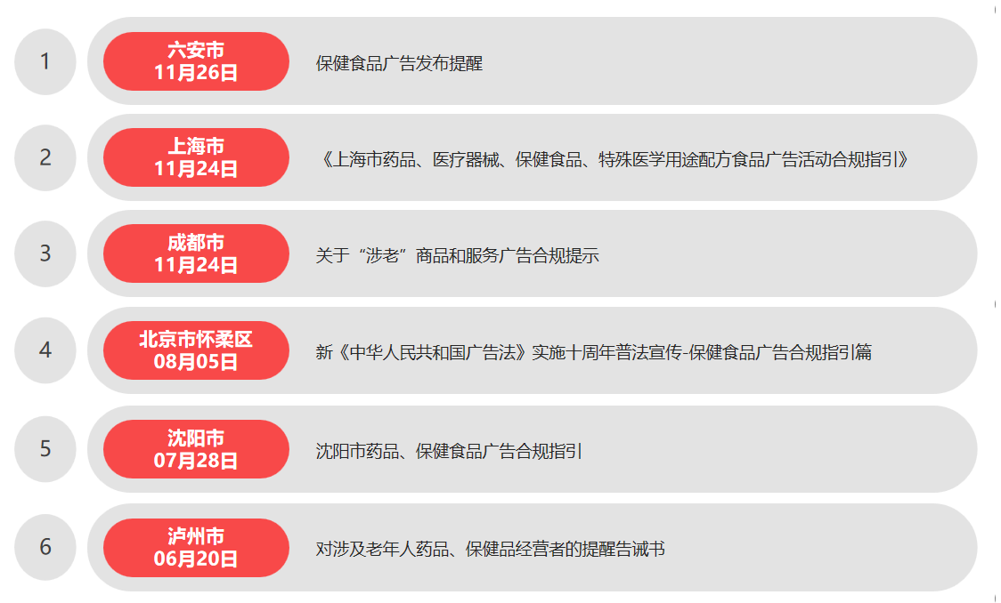 各地对保健食品广告发布的合规性也提出了更为具体、清晰的合规指引与监管措施,让合规要求更具针对性,例如: