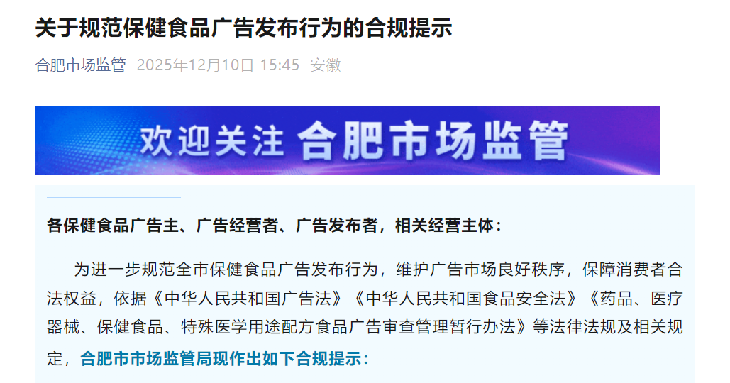 近日,合肥市市场监管局发布“关于规范保健食品广告发布行为的合规提示”,以清晰列举的方式提醒相关企业保健食品广告宣传红线。无论是广告主、广告经营者还是广告发布者等相关经营主体,都需紧盯地方监管要求,避免踩雷。