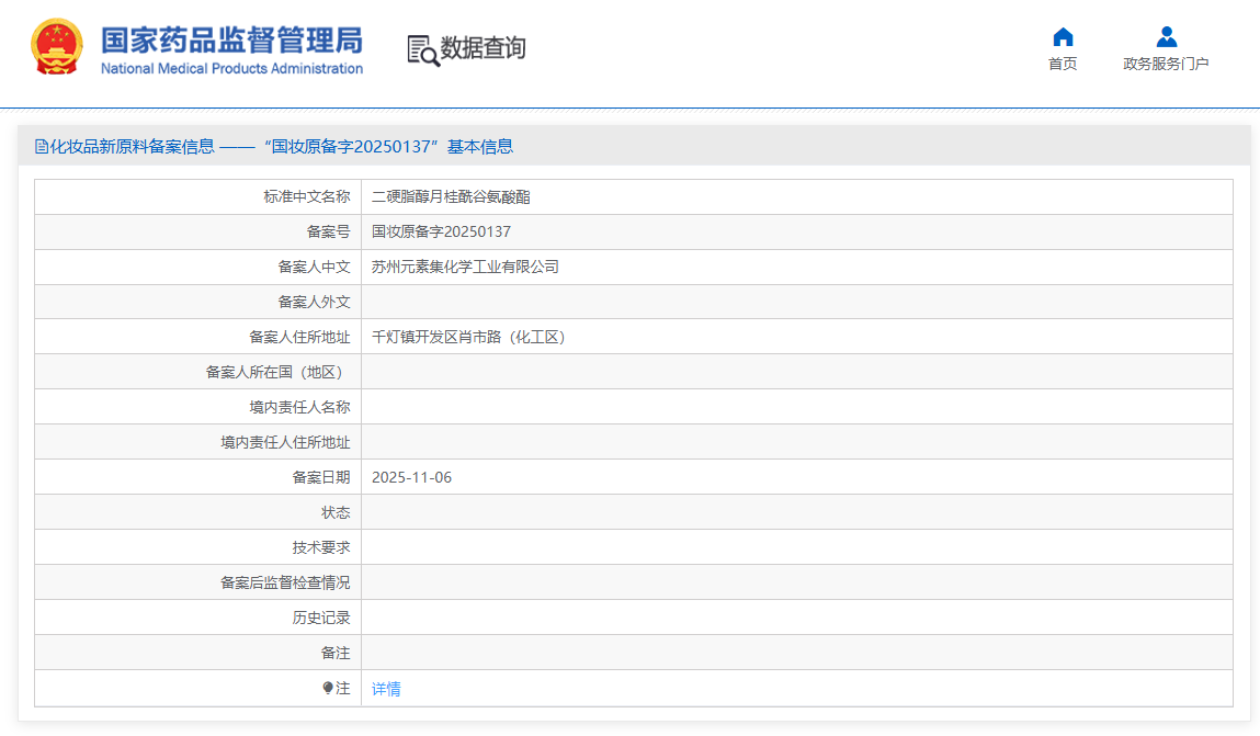 2025年11月6日,据国家药监局公示平台显示,二硬脂醇月桂酰谷氨酸酯完成化妆品新原料备案,进入公示阶段。