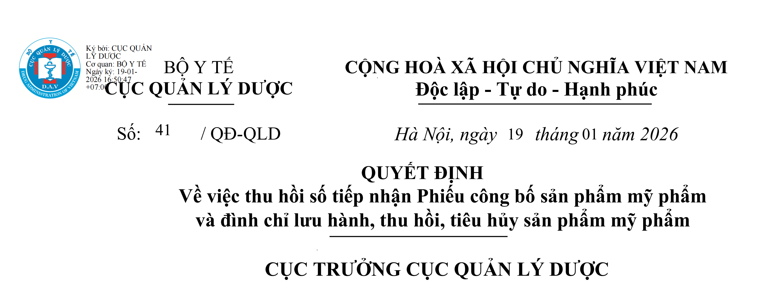 2026年1月19日,越南卫生部药品管理局(DAV)发布一则处罚公告:《关于收回化妆品产品公示单接收号及暂停流通、召回、销毁化妆品的决定》,对越南一家公司名下相关化妆品进行了处罚并公布相关执行要求,该决定自签发公布之日起正式生效。