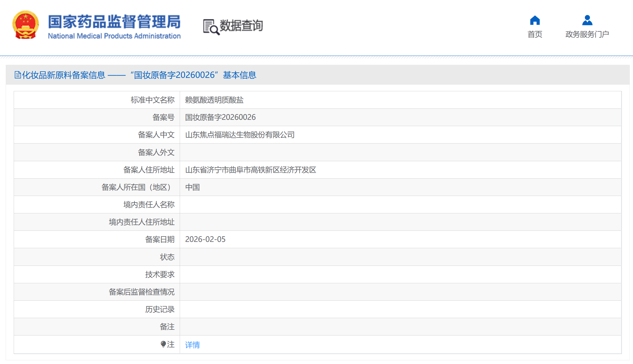 赖氨酸透明质酸盐(备案号:国妆原备字20260022),由山东焦点福瑞达生物股份有限公司备案。目前相关技术要求尚未披露,且尚未进入监测期。