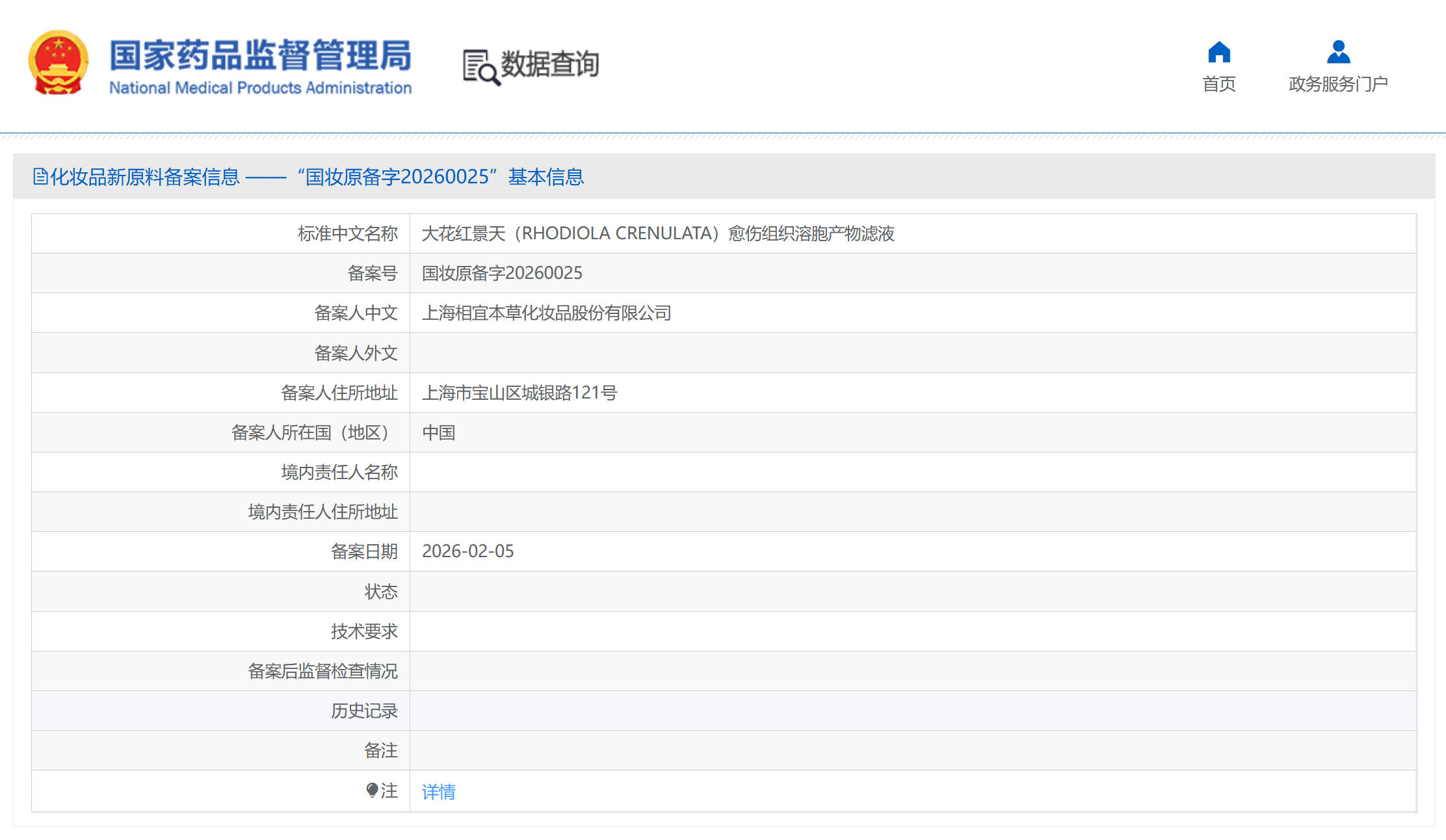 大花红景天(RHODIOLA CRENULATA)愈伤组织溶胞产物滤液(备案号:国妆原备字20260025),由上海相宜本草化妆品股份有限公司备案。目前相关技术要求尚未披露,且尚未进入监测期。