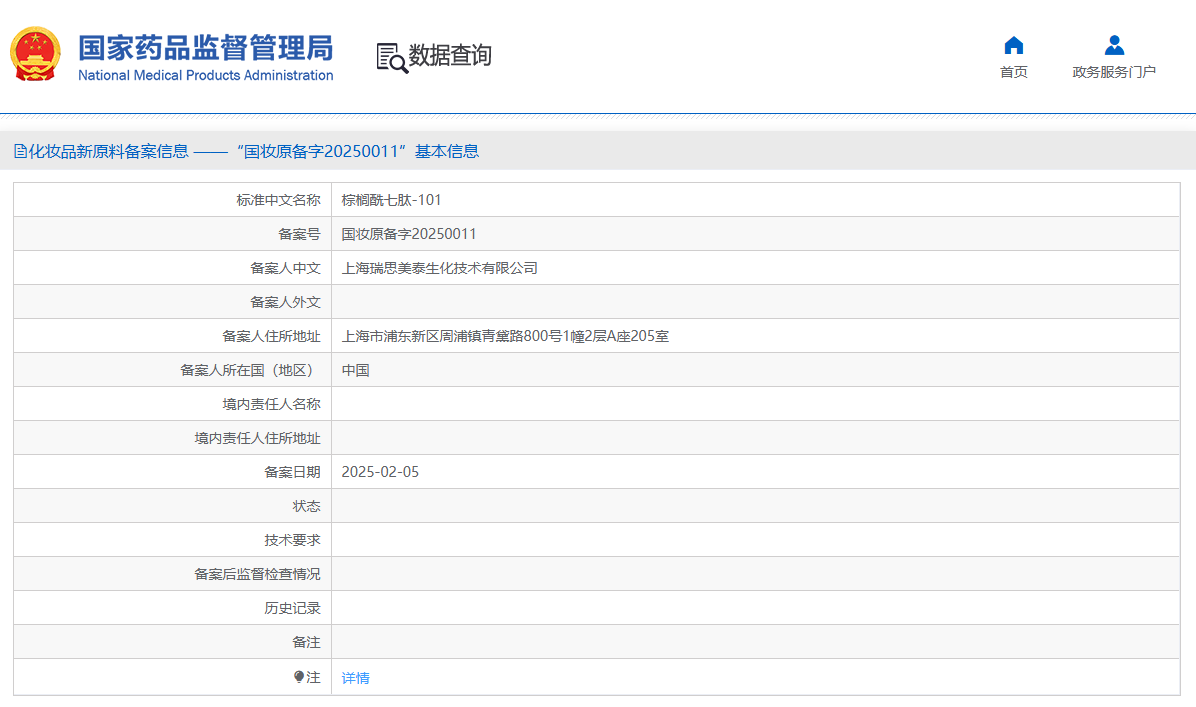 2025年2月5日,据国家药监局公示平台显示,棕榈酰七肽-101完成化妆品新原料备案,进入公示阶段。