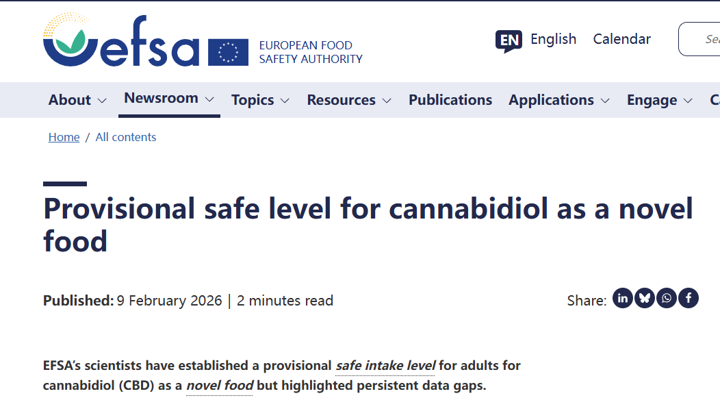 2026年2月9日,欧洲食品安全局(EFSA)发布最新声明,其营养、新型食品和食品过敏原专家小组(NDA)为作为新型食品的大麻二酚(CBD)制定了成人暂定每日安全摄入量标准,同时明确该标准的适用范围,并指出目前关于 CBD 的安全性研究仍存在多项数据缺口,相关评估工作将持续推进。