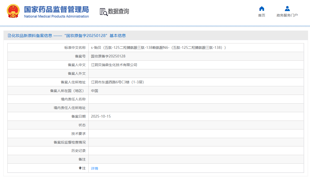 据国家药监局公示平台显示,江阴贝瑞森生化技术有限公司的s-贻贝(五肽-125二羟脯氨酸三肽-138赖氨酸N6-(五肽-125二羟脯氨酸三肽-138))(备案号:国妆原备字20250128)已于2025年10月15日完成新原料备案,进入公示阶段。