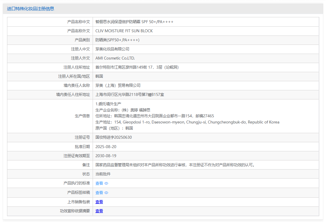 据进口特殊化妆品注册信息平台显示,韩国芽美化妆品有限公司旗下品牌CLIV (皙俪思)的一款高倍防晒产品已顺利完成特殊化妆品注册,证书编号为:国妆特进字20250630。我们对芽美的顺利注册表示诚挚地祝贺!