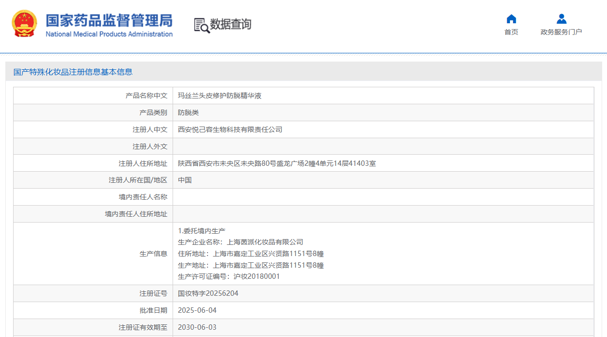 据国产特殊化妆品注册信息平台显示,玛丝兰(MASIL)的2款防脱产品已顺利完成特殊化妆品注册,分别为:防脱精华液和防脱洗发水。在此,我们对玛丝兰的顺利注册表示诚挚地祝贺!