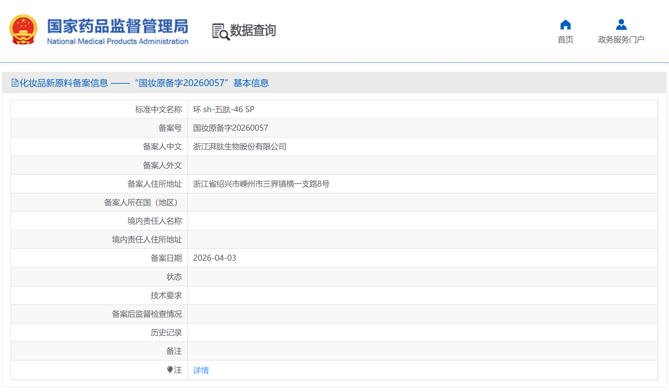 据国家药监局公示平台显示,浙江湃肽生物股份有限公司的环 sh-五肽-46 SP(备案号:国妆原备字20260057)已于2026年4月3日完成新原料备案,进入公示阶段。