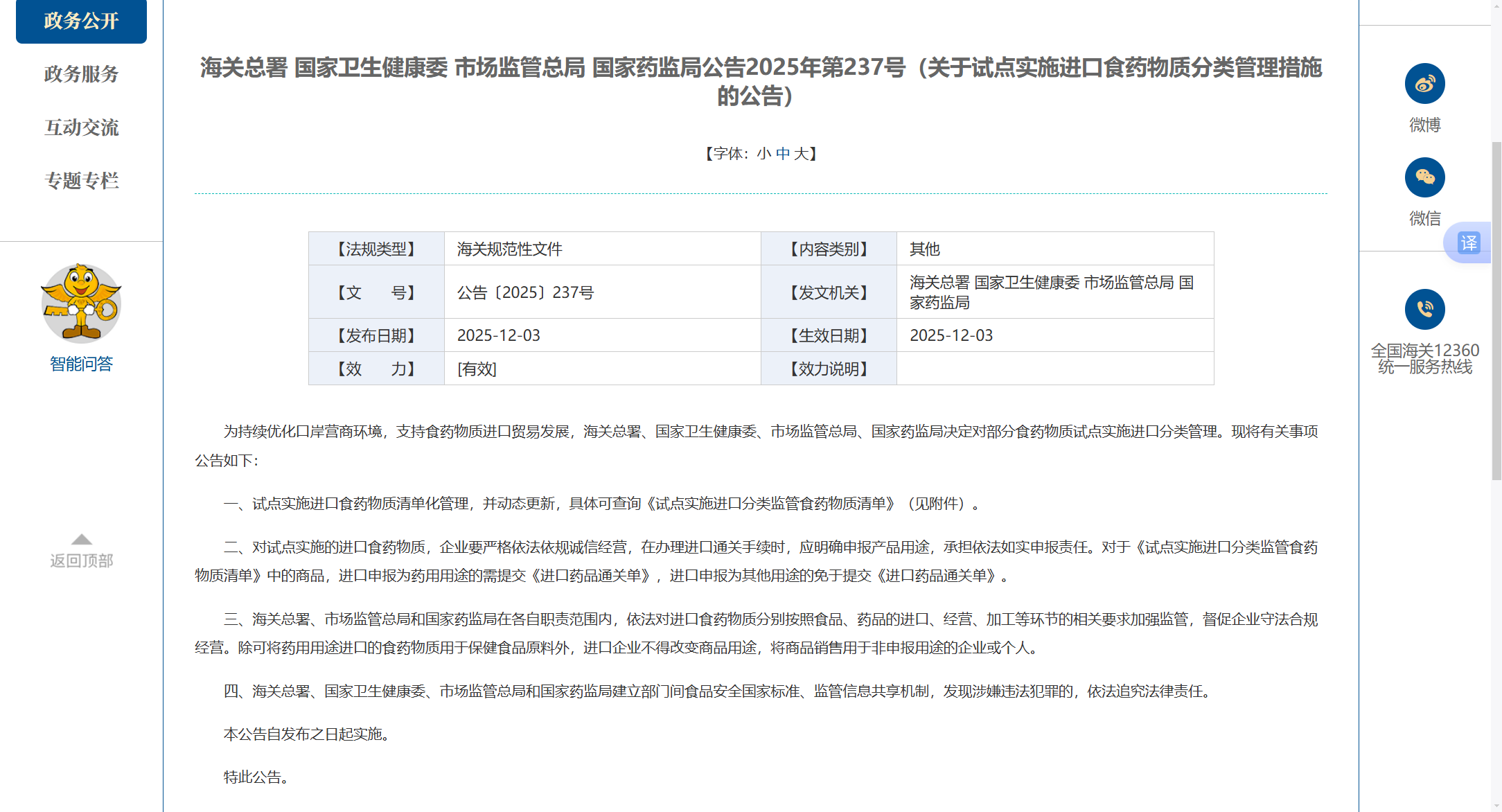 如:2025年12月5日枣庄海关成功办理了全国首票适用“食药物质分类管理措施”的进口业务,2025年12月7日云南首批“非药用”姜黄在打洛口岸快速通关,都标志着我国在优化食药物质进口监管方面迈出重要一步。