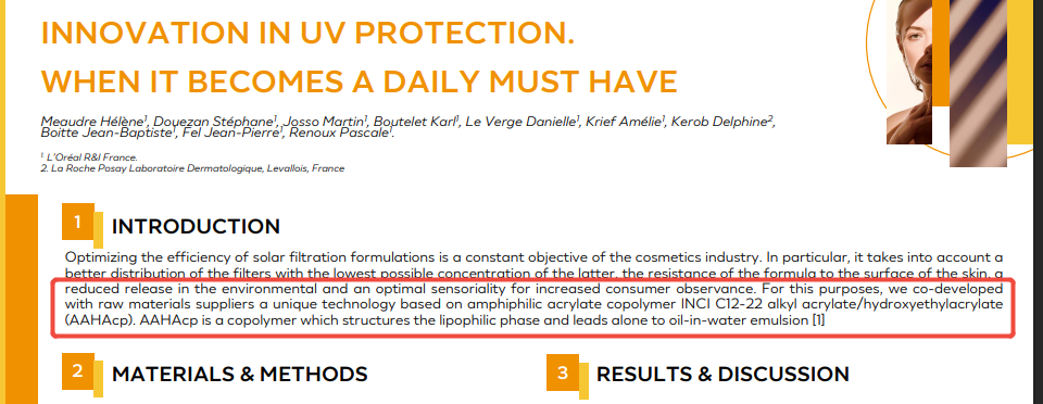 根据欧莱雅皮肤科学美容(L'Oréal Dermatological Beauty)官网在2024年7月发布的相关科研海报显示,C12-22 Alkyl Acrylate/Hydroxyethylacrylate Copolymer(与本次备案通过的新原料同名)系欧莱雅与原料供应商深度协作开发的防晒创新原料。