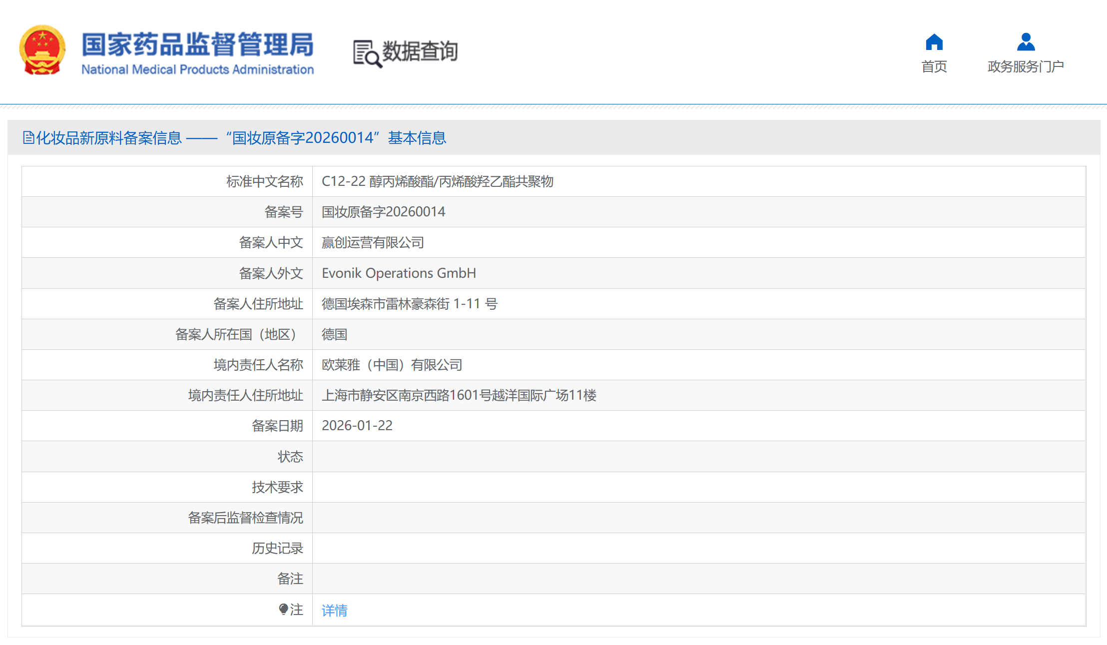 2026年1月22日,据国家药监局公示平台显示,C12-22 醇丙烯酸酯/丙烯酸羟乙酯共聚物完成化妆品新原料备案,进入公示阶段。