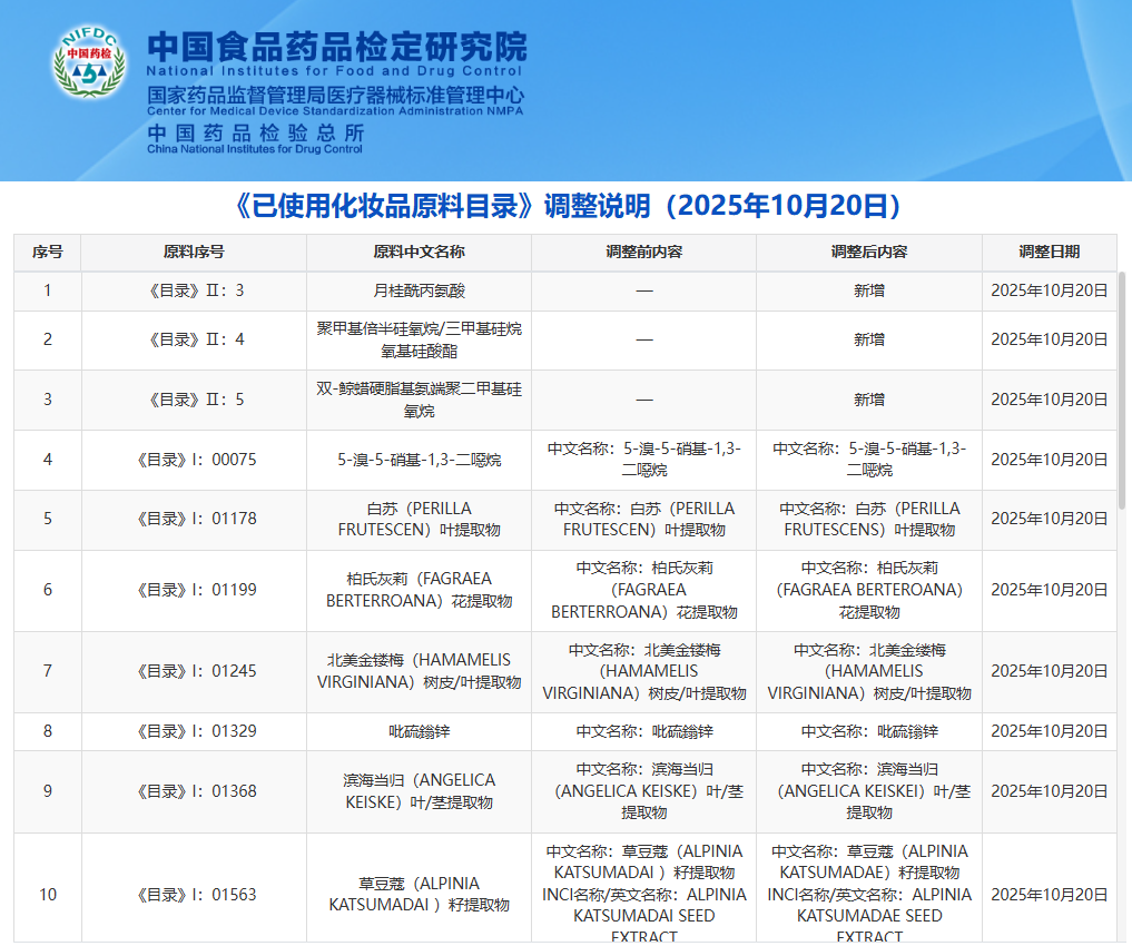 10月20日,根据《国家药监局关于<已使用化妆品原料目录>管理有关事项的公告》,国家药监局对《已使用化妆品原料目录》(以下简称《目录》)进行第二次动态调整。