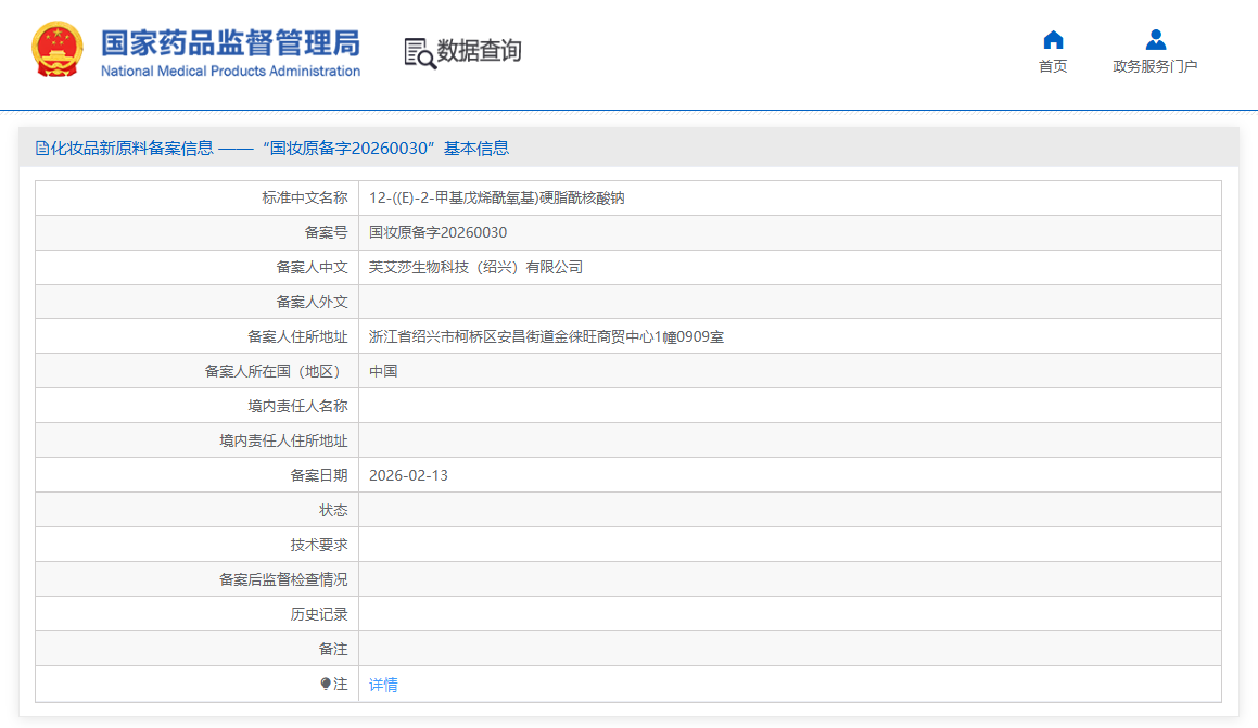 2026年2月13日,据国家药监局公示平台显示,12-((E)-2-甲基戊烯酰氧基)硬脂酰核酸钠、s-无指盘臭蛙寡肽-1,完成化妆品新原料备案,进入公示阶段。