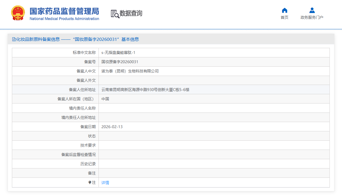 s-无指盘臭蛙寡肽-1(备案号:国妆原备字20260031),由诺为泰(昆明)生物科技有限公司。目前相关技术要求尚未披露,且尚未进入监测期。