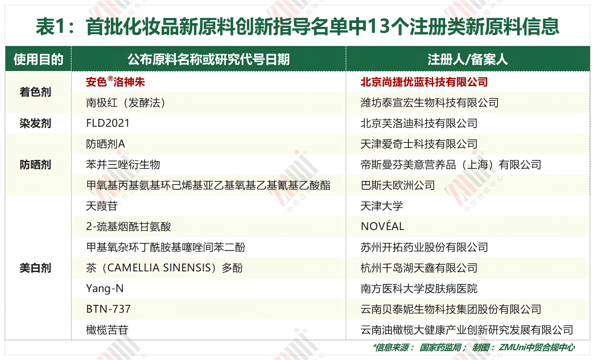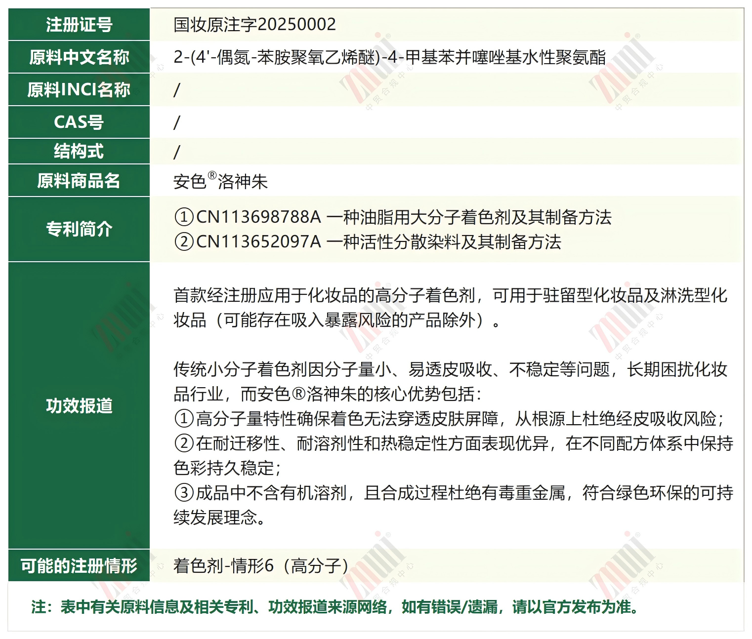 10月20日,中检院发布首批化妆品新原料创新指导名单,16 个拟开展创新指导的品种中,13 个属于注册类新原料。其中,北京尚捷优蓝科技有限公司的安色®洛神朱已于2025年10月30日成功注册,进入公示阶段。新原料名称为:2-(4'-偶氮-苯胺聚氧乙烯醚)-4-甲基苯并噻唑基水性聚氨酯(注册证号:国妆原注字20250002)。