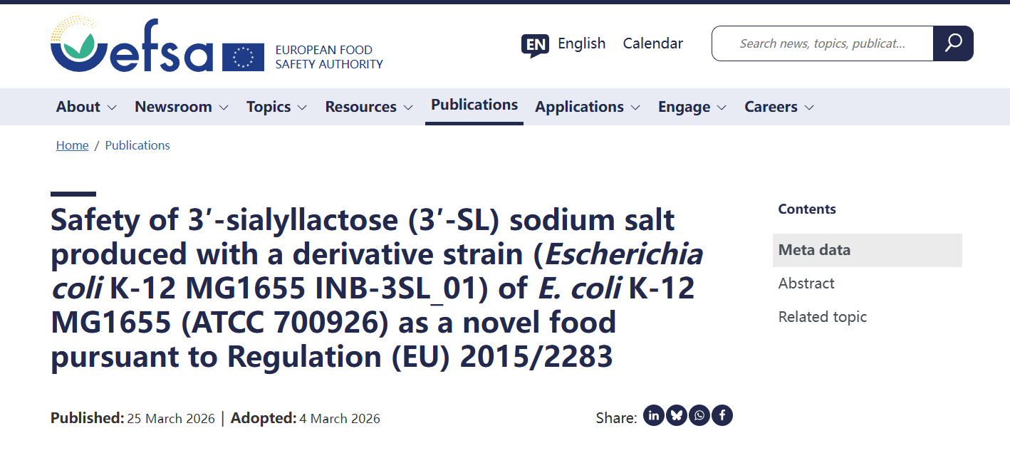 2026年3月25日,欧洲食品安全局(EFSA)就1款3′-唾液酸乳糖钠盐(3′-SL)作为新型食品的安全性出具科学意见。