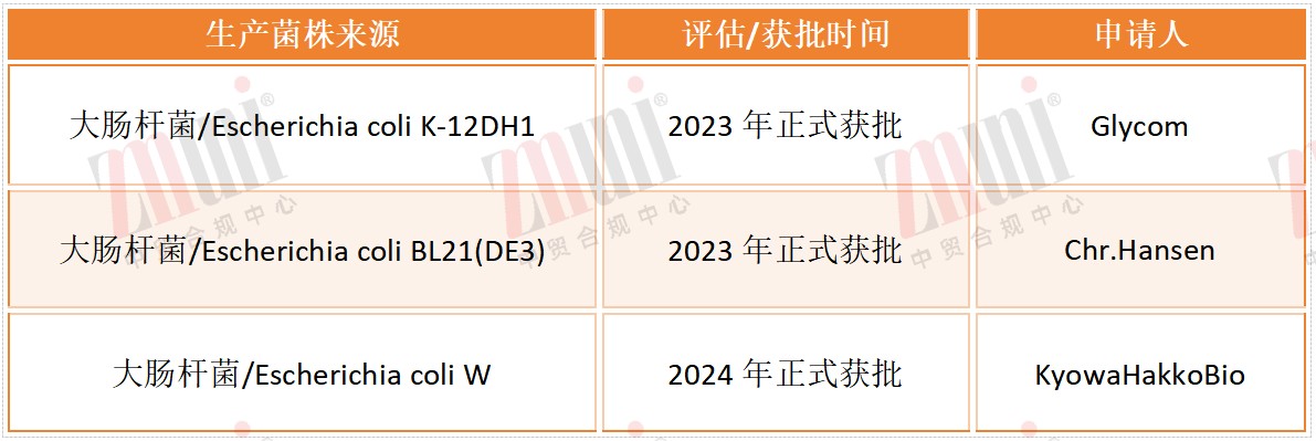 本次批准的3'-SL生产菌来源有Escherichia coli BL21(DE3)、Escherichia coli W(ATCC 9637)和Escherichia coli K-12 DH1 MDO。