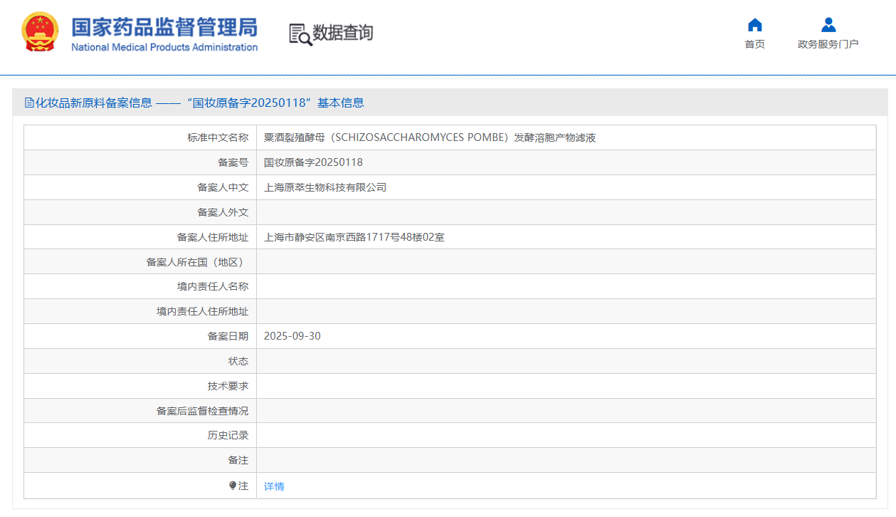 粟酒裂殖酵母(SCHIZOSACCHAROMYCES POMBE)发酵溶胞产物滤液(备案号:国妆原备字20250118),由上海原萃生物科技有限公司备案。目前相关技术要求尚未披露,且尚未进入监测期。