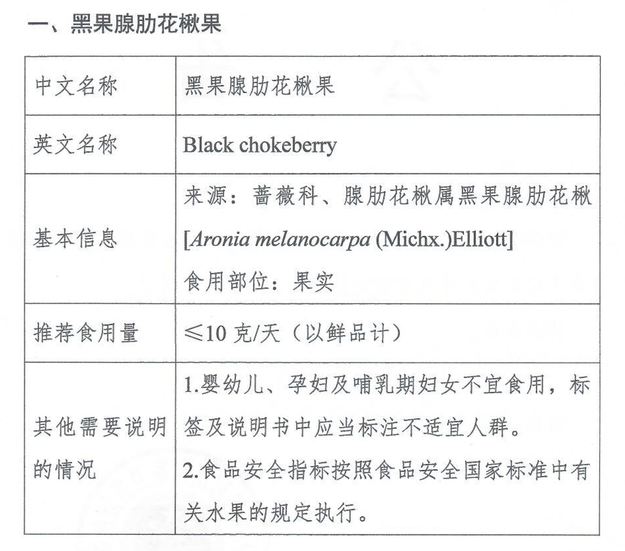 2018年9月12日,国家卫健委发布“关于黑果腺肋花楸果等2种新食品原料的公告 (2018年 第10号)”正式批准黑果腺肋花楸果为新食品原料。