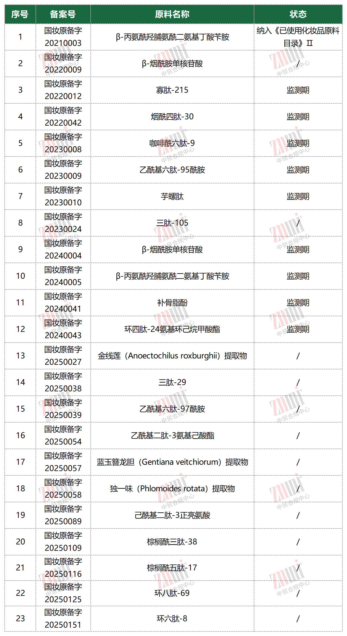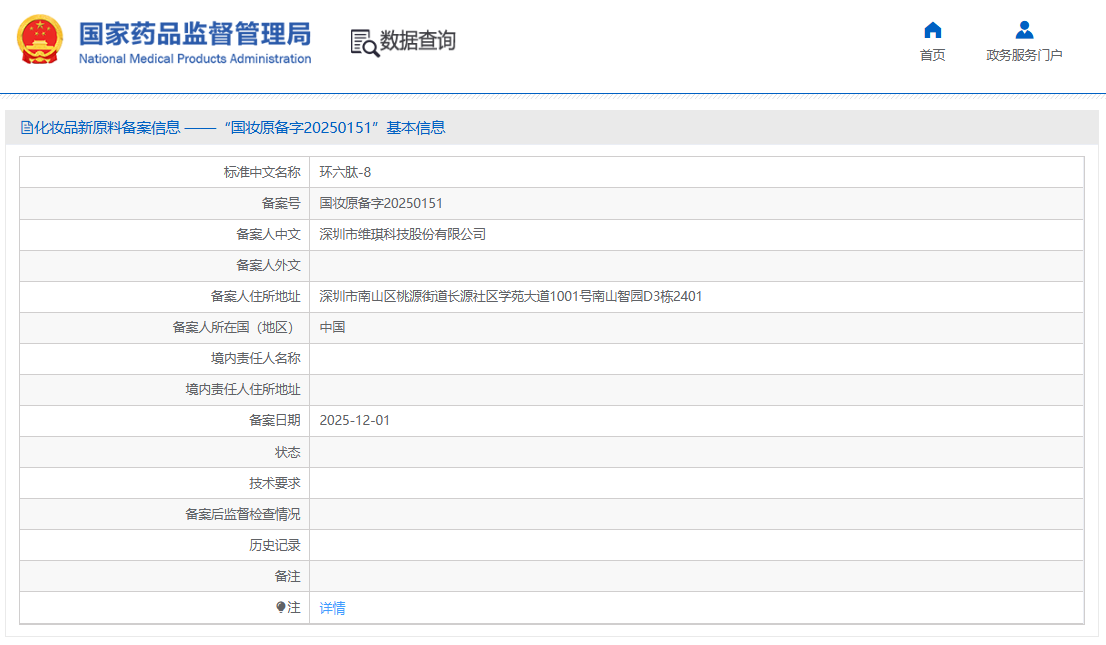 2025年12月1日,据国家药监局公示平台显示,环六肽-8完成化妆品新原料备案,进入公示阶段。