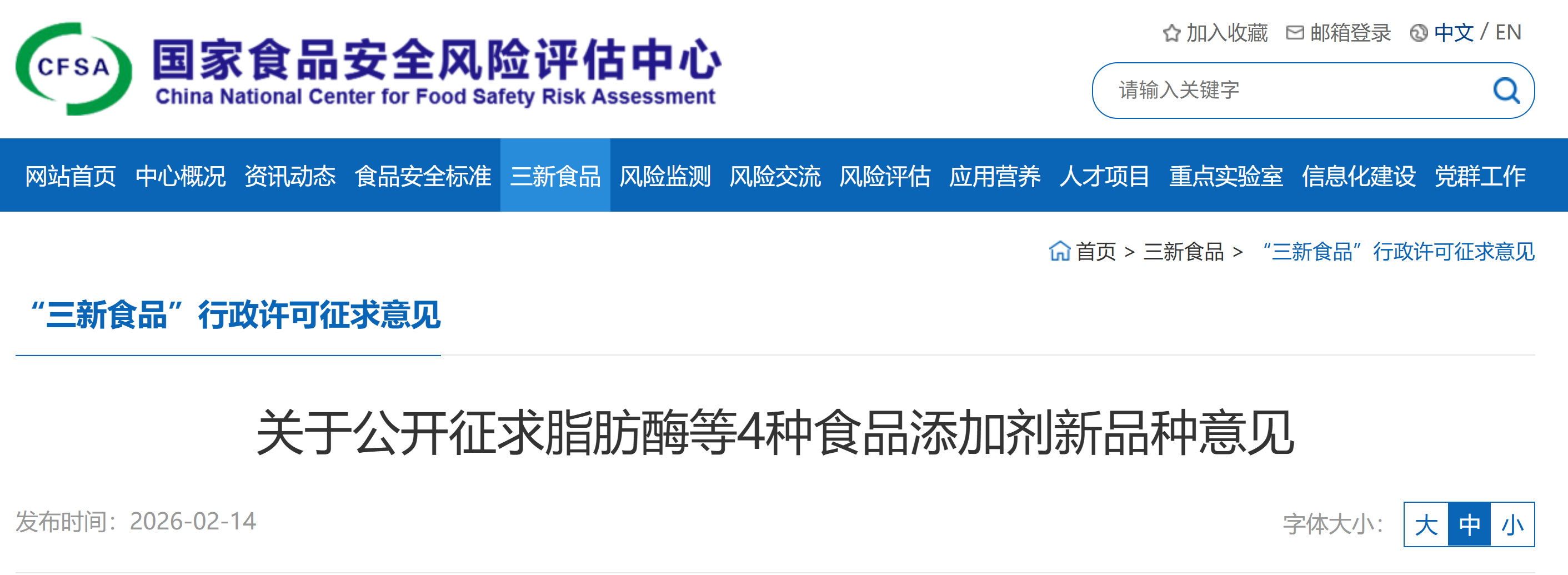 根据《食品添加剂新品种管理办法》和《食品添加剂新品种申报与受理规定》,食品添加剂新品种脂肪酶、食品营养强化剂新品种3-岩藻糖基乳糖和乳糖-N-四糖、扩大使用范围的食品添加剂硫酸铵的申请,其安全性和工艺必要性已通过专家评审委员会技术审查(具体情况见附件),现公开征求意见。请于2026年3月16日前将相关意见反馈至我中心邮箱(zqyj@cfsa.net.cn),逾期将视为无意见。