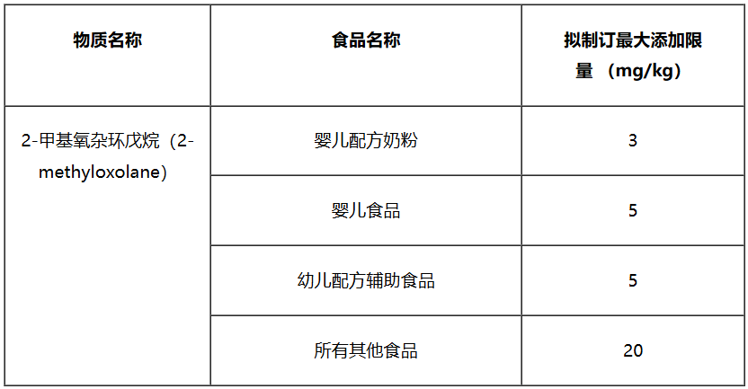 2. 2025年1月8日,澳大利亚联邦政府公报发布F2025L00012号公告,制订2-甲基氧杂环戊烷(2-methyloxolane)作为食品加工助剂在部分食品中的最大添加限量(见下表)。该公告自政府公报发布之日起生效。