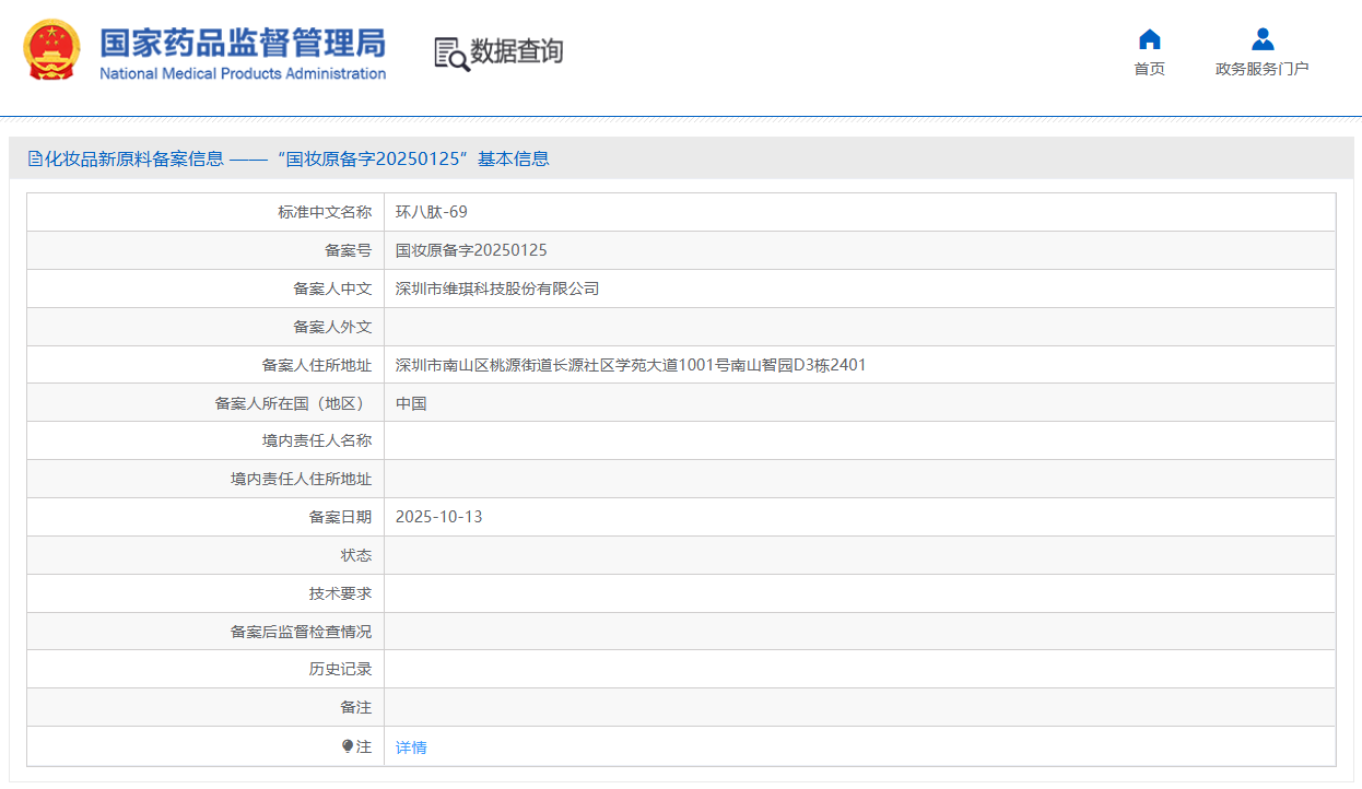 环八肽-69(备案号:国妆原备字20250125),由深圳市维琪科技股份有限公司备案。目前相关技术要求尚未披露,且尚未进入监测期。
