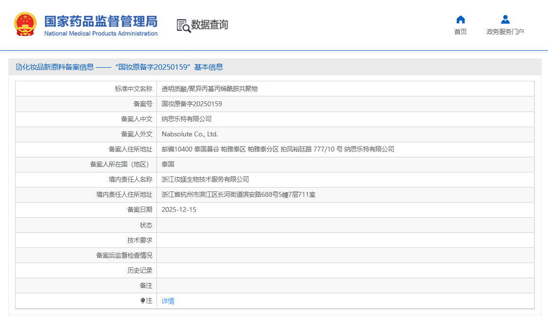 据国家药监局公示平台显示,纳思乐特有限公司的透明质酸/聚异丙基丙烯酰胺共聚物(备案号:国妆原备字20250159)已于2025年12月15日完成新原料备案,进入公示阶段,这也是首个由泰国企业完成备案的化妆品新原料。