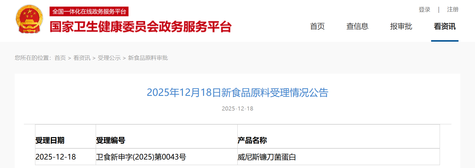 🟠新食品原料-新增受理1例:威尼斯镰刀菌蛋白